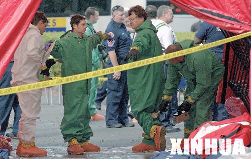 在美國佛羅里達(dá)州的杰克遜維爾市,從發(fā)生爆炸的尤尼森工業(yè)公司走出的救援人員接受輻射檢查