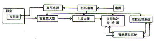 能譜數(shù)據(jù)獲取與處理系統(tǒng):由ADC智能獲取接口和計算機組成。探測器到ADC行!獢(shù)轉(zhuǎn)換,智能獲取接口對ADC的每個復(fù)換碼進行實時處理、顯示、數(shù)據(jù)壓縮,并每隔一定時間將已壓縮的數(shù)據(jù)由接口傳送至計算機,已進行譜顯示的更新,每個譜的長度、寬度、停機方式和條件,起、停都由計算機獨立控制。在測量過程中,計算機可以停機或處理其它數(shù)據(jù)。